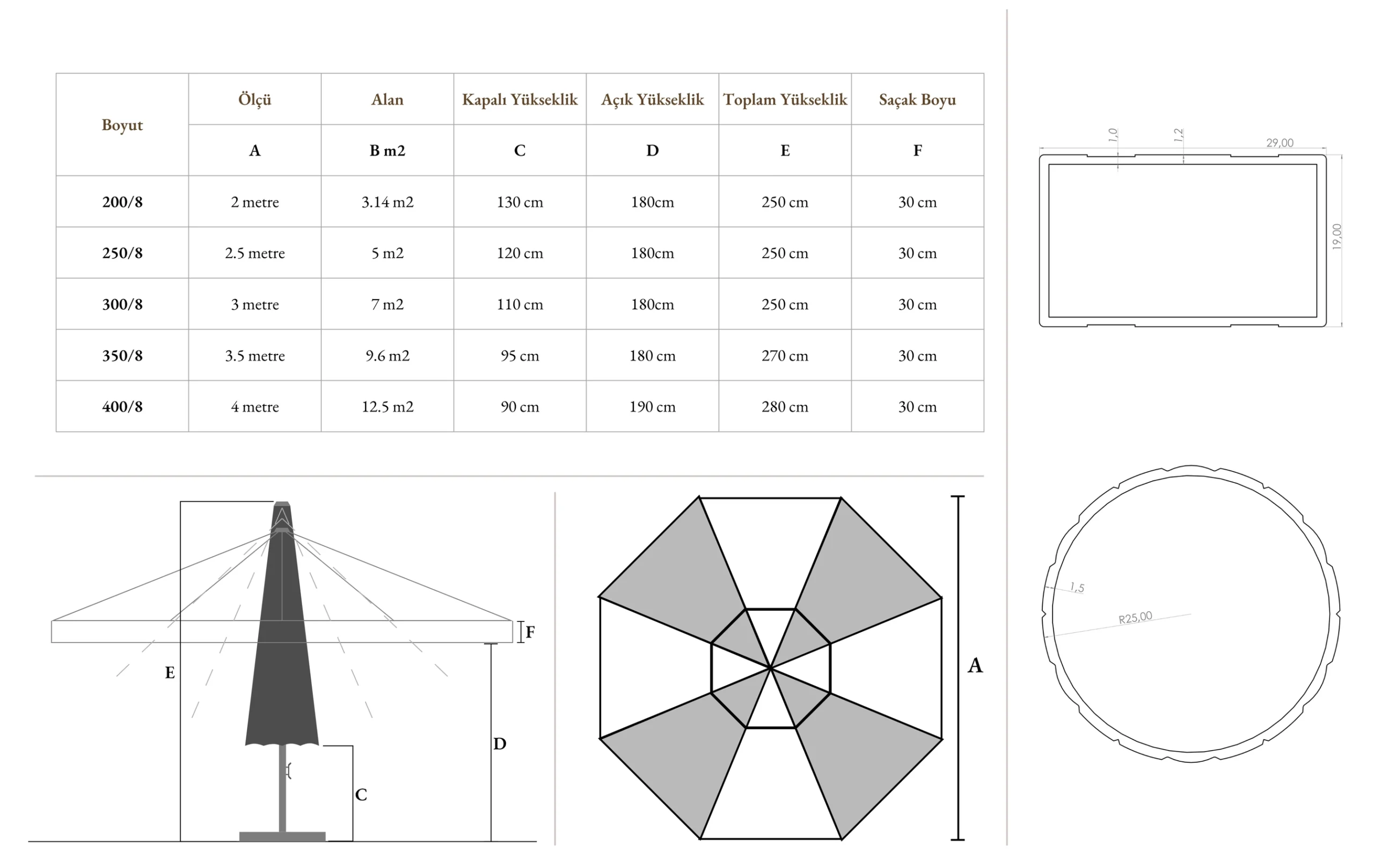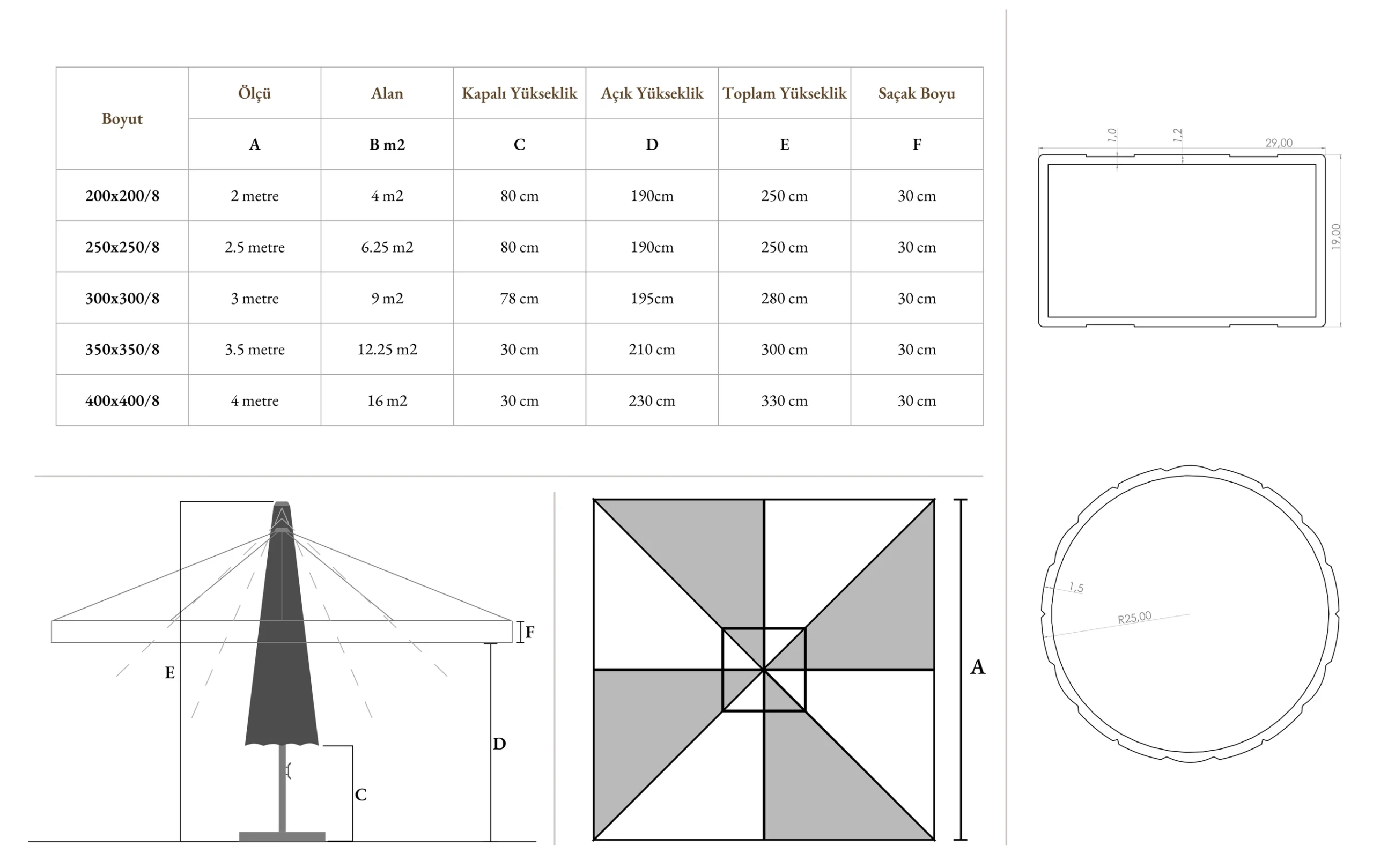 7 yıl garantili ithal akrilik kumaşla veya polyester yerli üretim kumaşla üretilebilir. Baskılı kumaş alternatifleri mevcuttur.