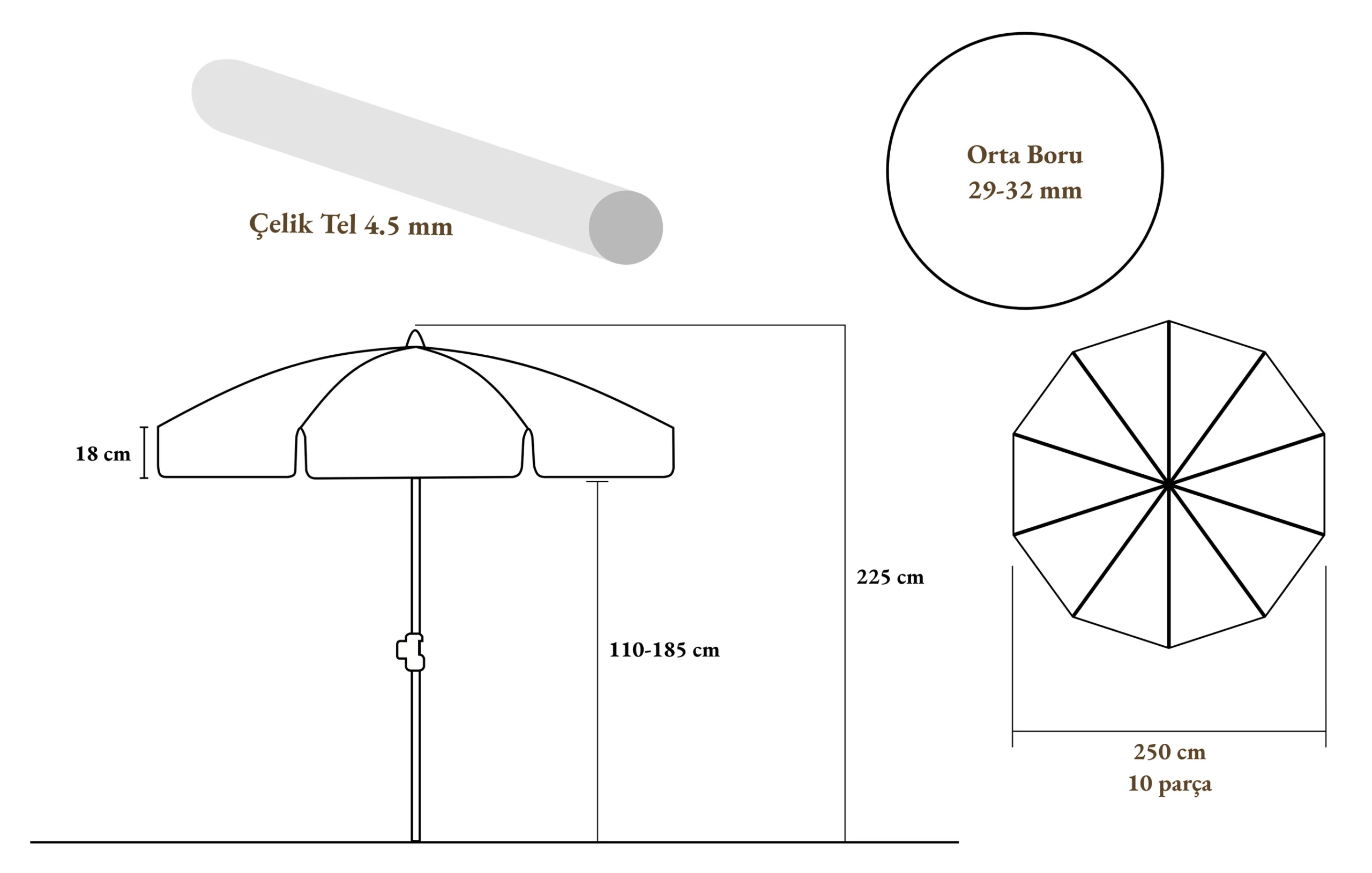 Solea Ultra, 10 telli tasarımı ve 250 cm çapı ile mükemmel bir dayanıklılık sunar. Gelişmiş yapısı, yüksek rüzgar dayanımını garantilerken, kompakt boyutu ile sahilde her zaman rahatlıkla kullanılabilir. Küçük ama etkili gölgeleme alanı sunar, uzun süreli kullanım için idealdir. Bu model, sadece dayanıklılığı değil, aynı zamanda şık ve fonksiyonel yapısı ile de öne çıkar.