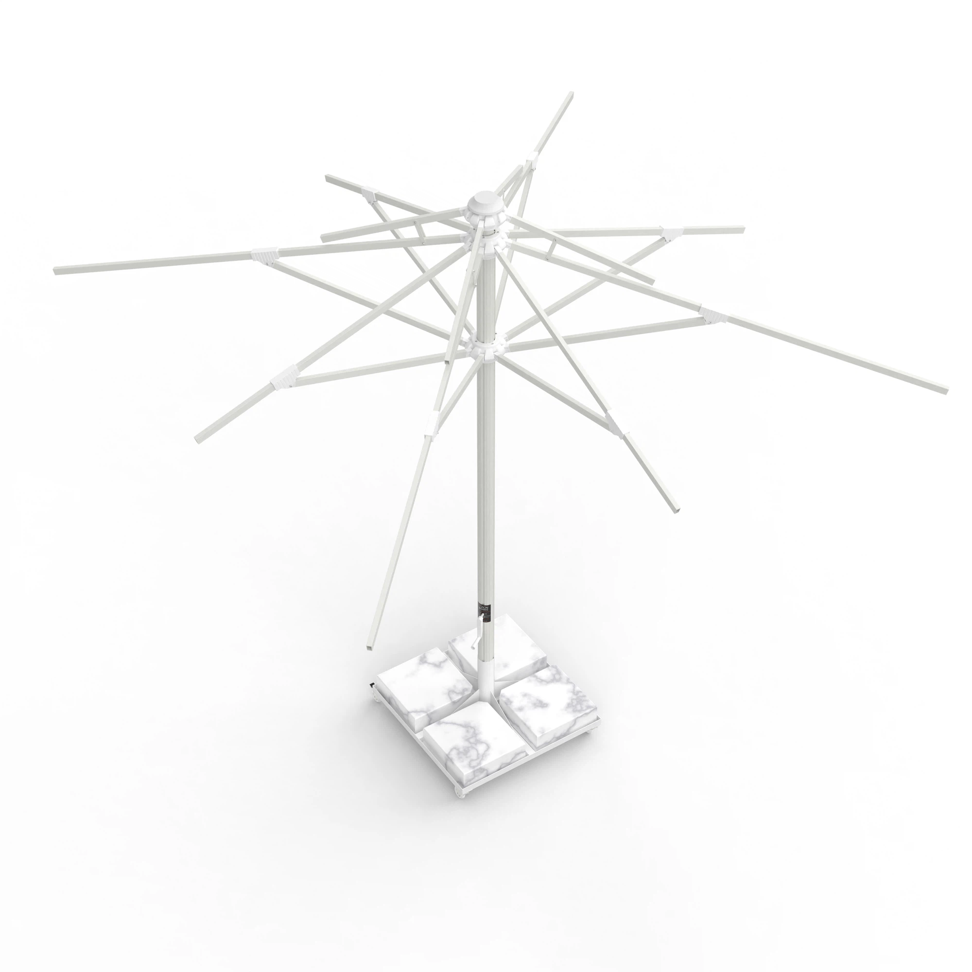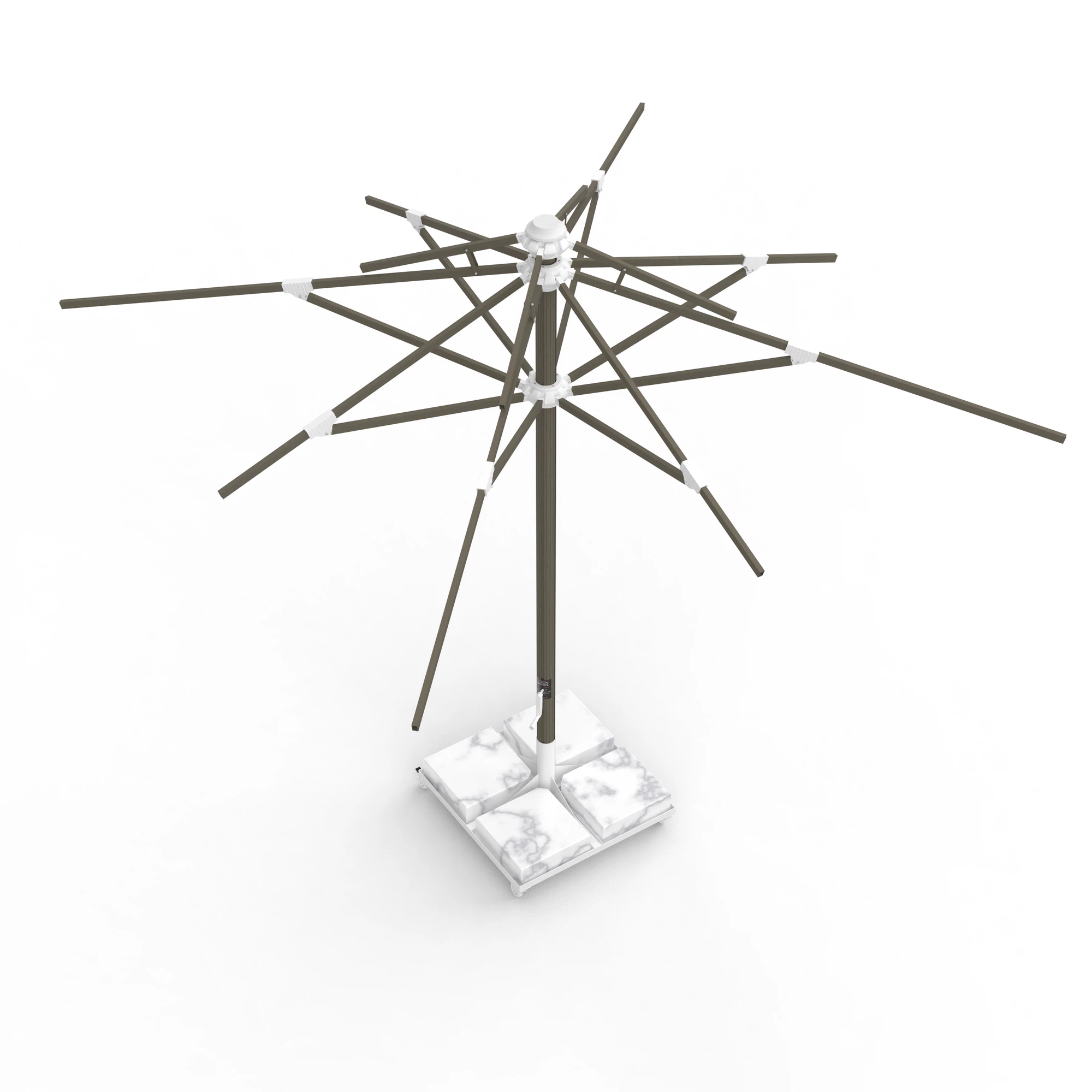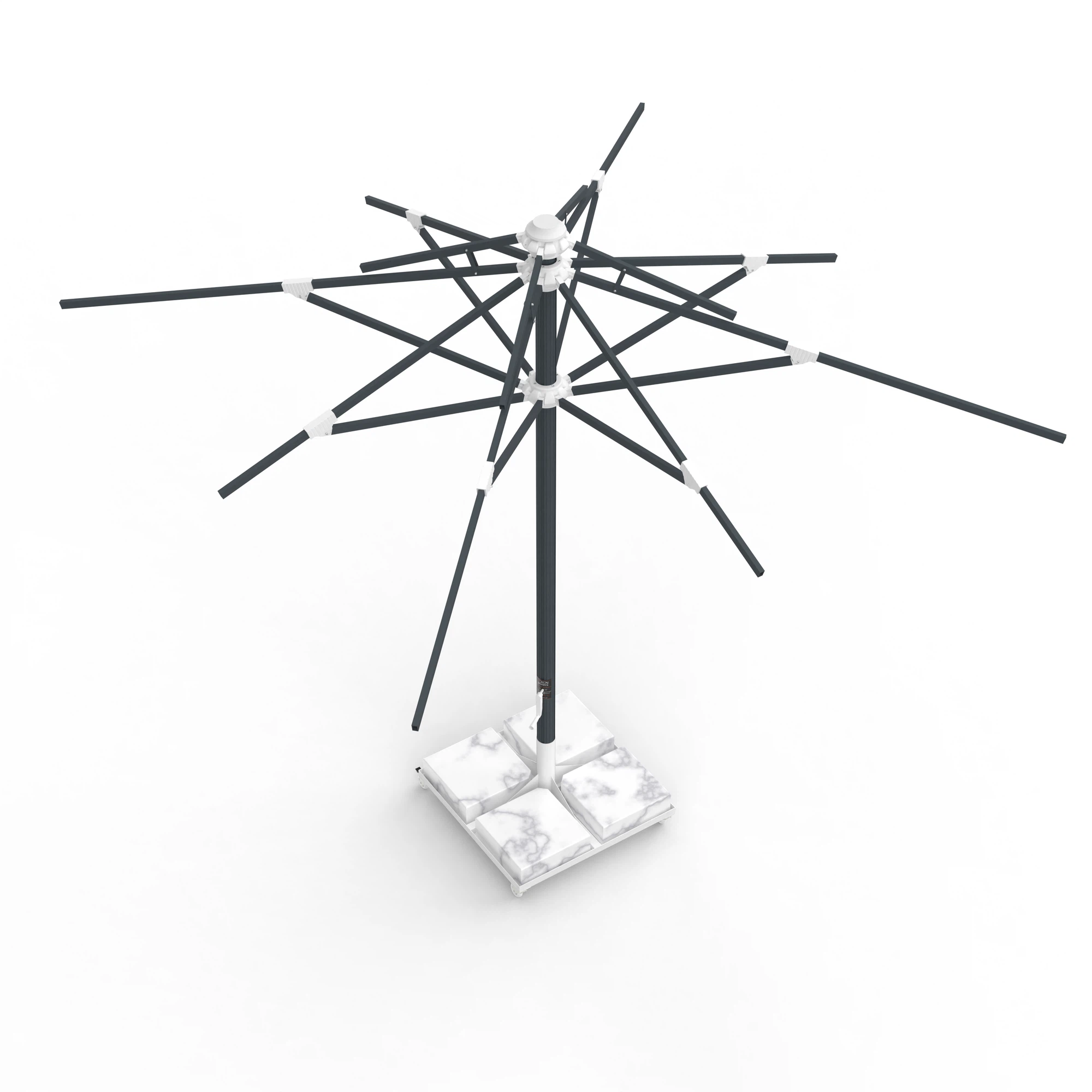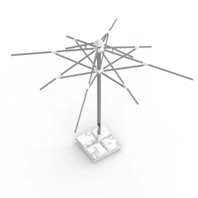 8 kollu taşıyıcı sistem, 21,5×34 mm federli alüminyum kollar ile güçlendirilmiş olup rüzgâr yükünü dengeli biçimde dağıtır. 84 mm çapındaki orta boru, sağlam bir taşıyıcı omurga oluşturur.